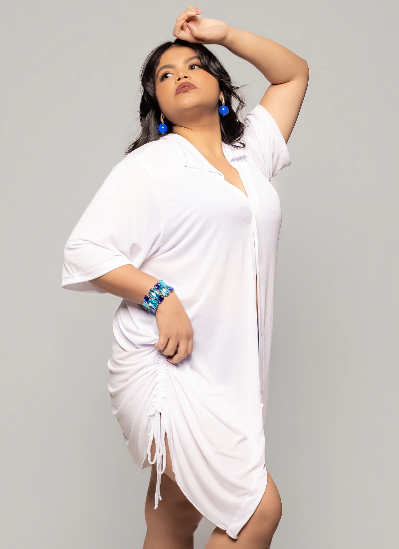 A Camisa Branca Alongada é a definição de versatilidade e elegância. Com modelagem ampla e comprimento alongado, ela é perfeita para compor looks modernos e sofisticados. Seus drapeados ajustáveis nas barras laterais permitem duas formas de uso, proporcionando um toque especial à peça e adaptando-se a diferentes estilos.